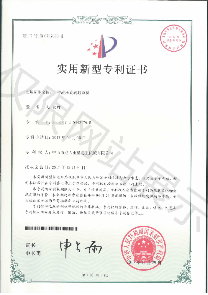 實用新型專利證書 -- 液壓旋轉起重機